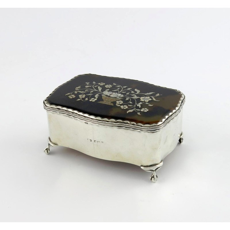 shaped rectangular form, the hinged cover inlaid with mother-of-pearl urn, and silver foliate decoration, on four claw and ball feet, length 13cm.