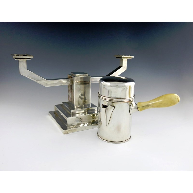 rectangular arms, square capitals, on raised stepped square bases, length 40cm, plus an old Sheffield plated shaving jug, of cylindrical form, pull-off cover, turned ivory baluster handle, height 17cm. (2)