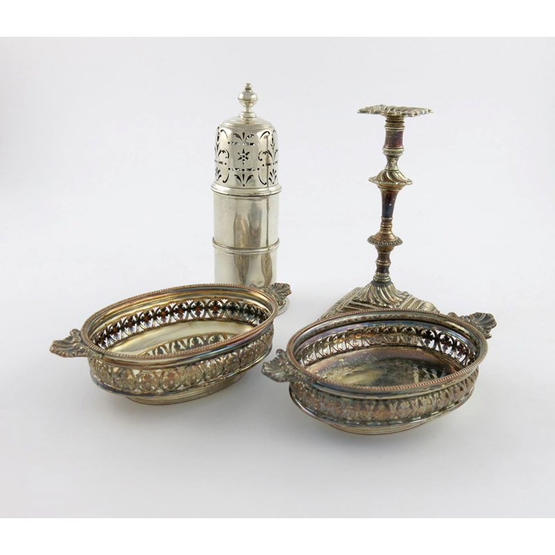 comprising: a George III taper stick, circa 1770, knopped stem, swirl-fluted decoration, on a raised square base, height 16.8cm, plus a sugar caster, of lighthouse form, pull-off pierced cover, and a pair of oval dishes, with pierced decoration and shell handles. (4)