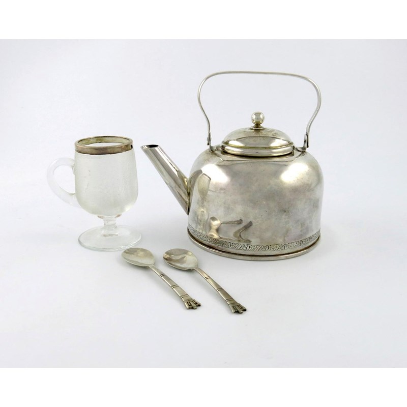 comprising silver items: a pair of spoons, by R. E. Stone, London 1935, the terminals with crowns, plus a silver-mounted ribbed glass, with a scroll handle, and an electroplated kettle. (4)
