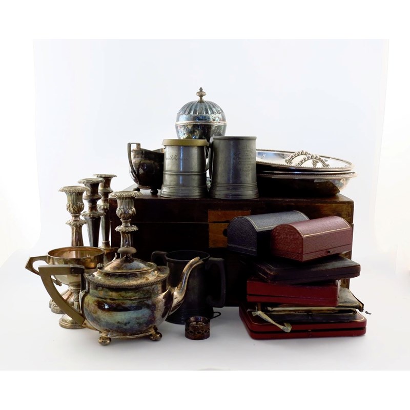 comprising silver items: a two-handled trophy cup, Birmingham 1938, plus electroplated items, two pairs of candlesticks, a teapot, a sugar bowl, a pair of entrée dishes and covers, an egg coddler, plus three pewter mugs, one with a presentation rowing inscription from Eton College, 1886, plus various empty silver cases and a wooden case, approx. weighable 4oz. (qty)