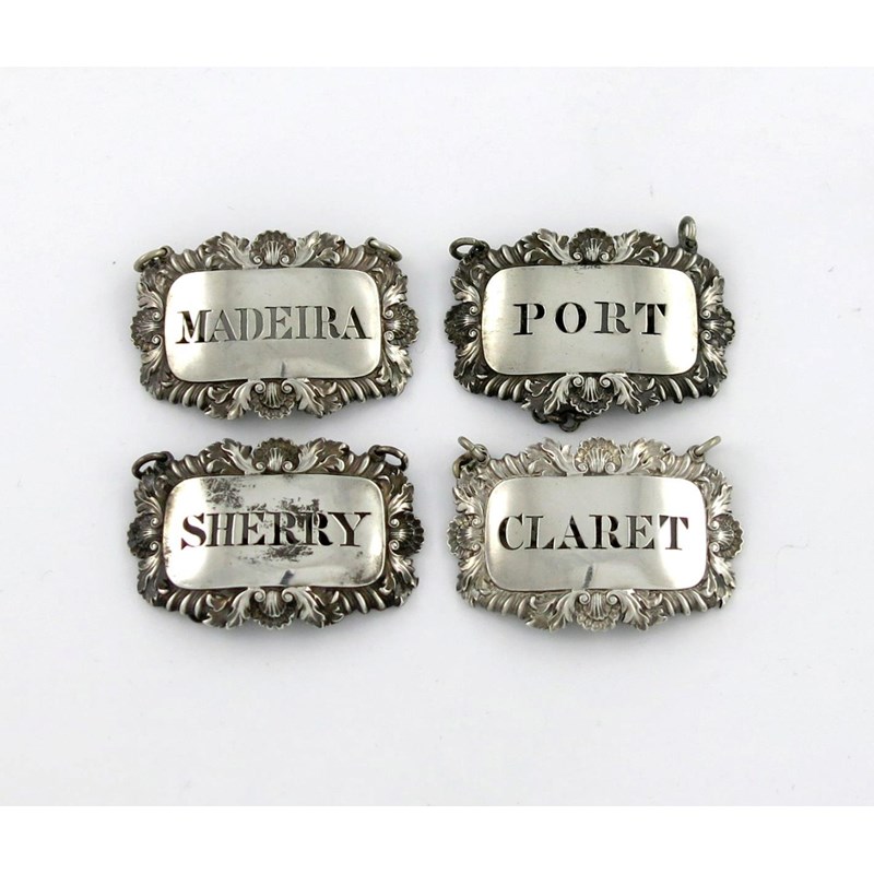 rectangular form, shell and gadroon borders, pierced 'MADEIRA', 'PORT', 'SHERRY' and 'CLARET', length 5.7cm, approx. weight 2.9oz. (4)