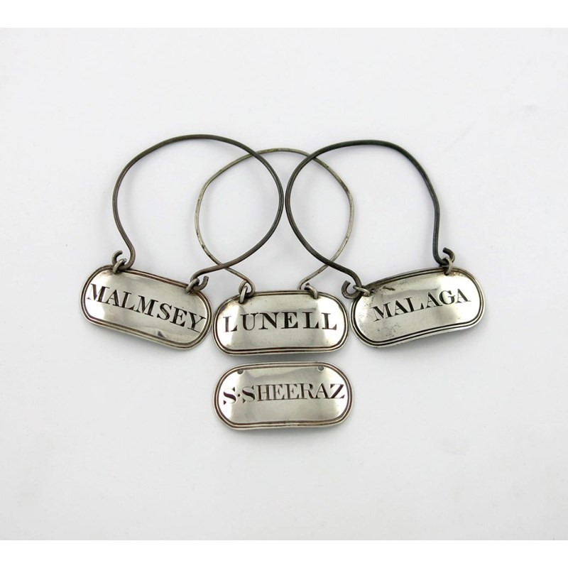 oblong form, reeded border, three with ring mounts, blackened ' MALAGA', 'MALMSEY', 'LUNELL' and 'S.SHEERAZ'. (4)