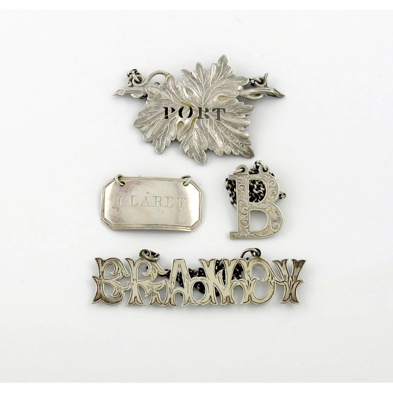 Sheffield 1904, titled 'BRANDY', plus another 'cut-out' label, 'B', Birmingham 1888, and early 19th century wine label, marked I.F twice, rectangular form, incised 'CLARET', and a vine leaf label, by Yapp and Woodward, Birmingham 1848, pierced 'PORT'. (4)