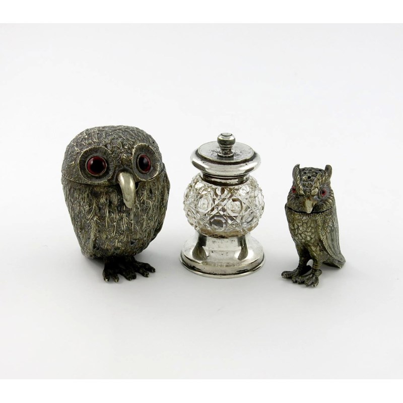 modelled in standing position, hinged cover, red glass eyes, with a cut out section on the body for a spoon, lacking liner, height 9cm, plus an electroplated owl pepper pot, pull-off cover, modelled in a standing position, red glass eyes, and an electroplated mounted glass pepper mill, hobnail cut body. (3)