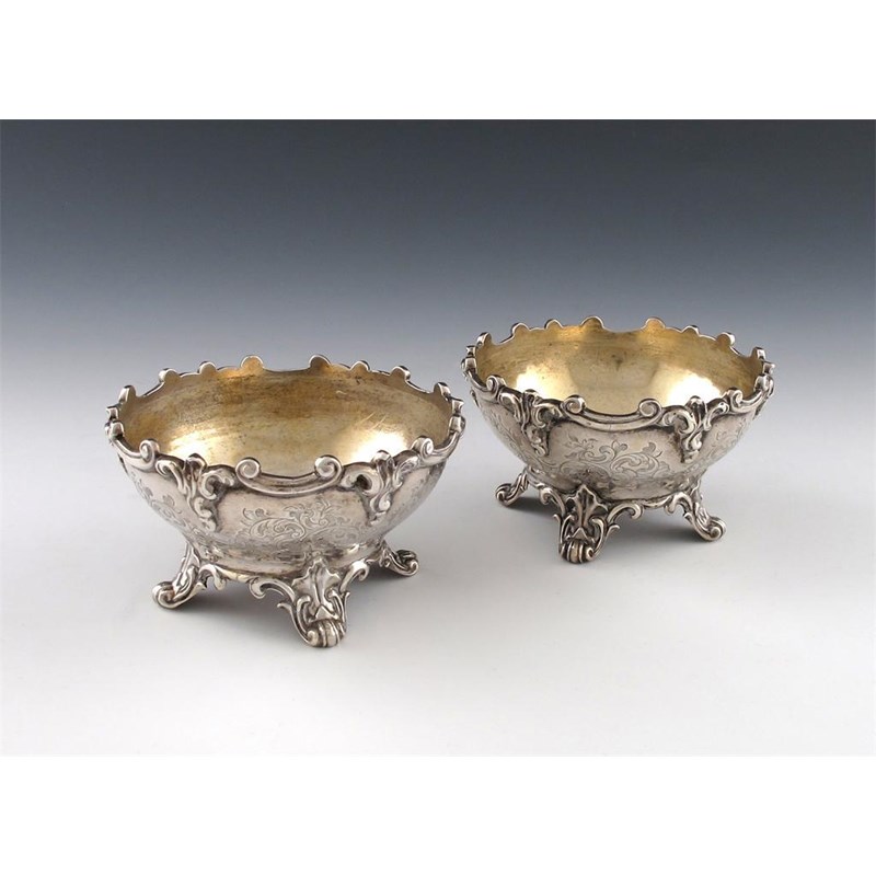 circular form, engraved foliate decoration, scroll borders, on four scroll bracket feet, gilded bowls, diameter 9.5cm, approx. weight 7.5oz. (2)