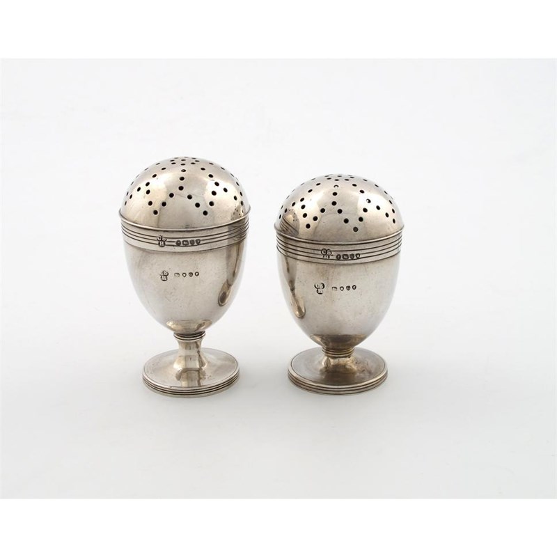 plain bun form, reeded girdle, on raised circular bases, one foot repaired and shortened, height 8cm and 7.3cm, approx. weight 3.5oz. (2)