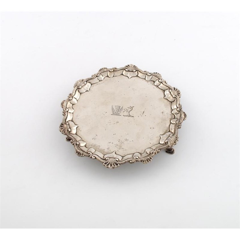 circular form, shell and scroll border, on three hoof feet, engraved with two crests, diameter 18cm, approx. weight 8oz.