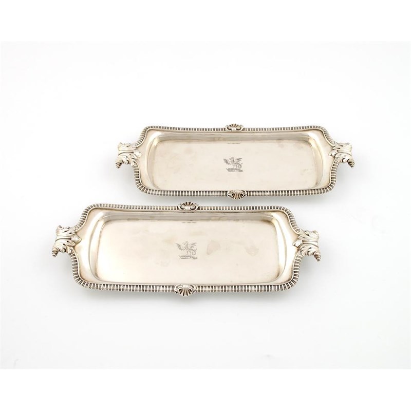 rectangular form, gadroon and shell border, with foliate handles, the centre engraved with a crest, length 24.8cm, approx. weight 16oz. (2)