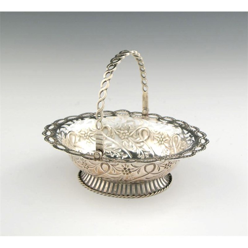 oval form, pierced and embossed foliate scroll decoration, pierced swing handle, engraved with a crest, on a pierced oval foot, length 15cm, approx. weight 3oz.