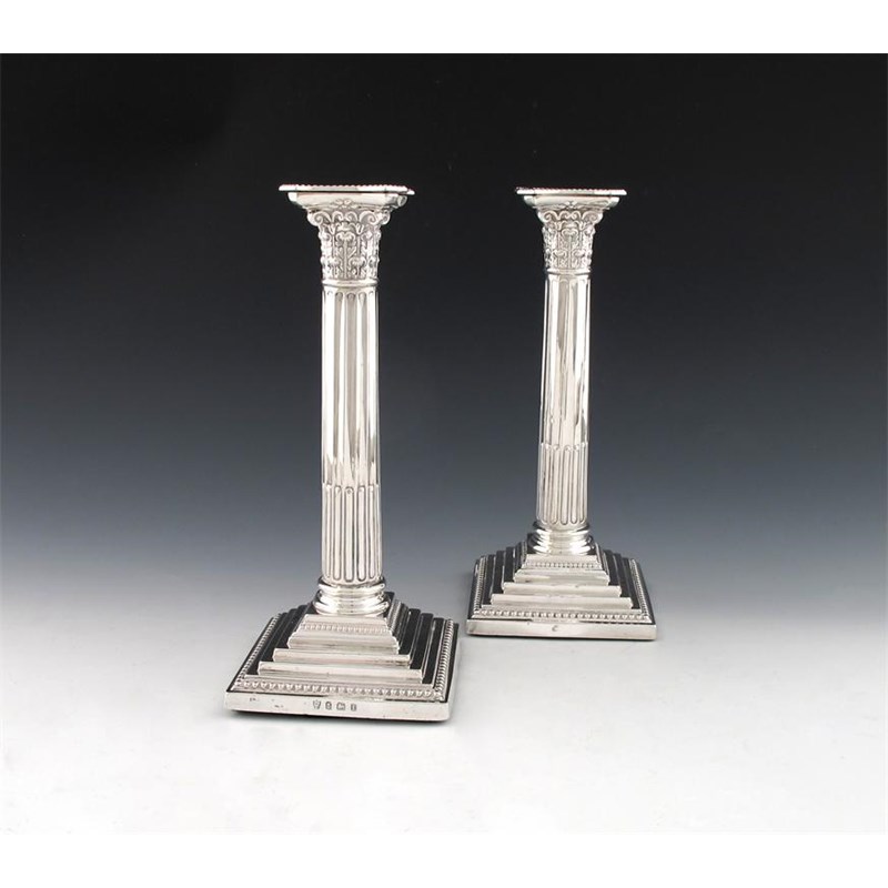 Corinthian column form, fluted stems, beaded borders on raised stepped square bases, height 24cm. (2)