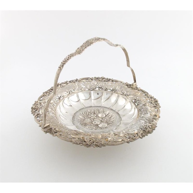 circular lobed form, embossed and pierced foliate and scroll border, foliate swing-handle, the centre embossed with fruit, on a raised circular foot,m engraved with two armorials, diameter 31.5cm, approx. weight 33oz.