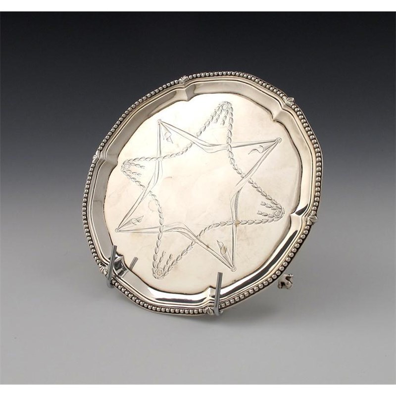 circular form, beaded border, the centre engraved with drapes and garlands of husks, on four claw and ball feet, diameter 15.7cm, approx. weight 8oz.