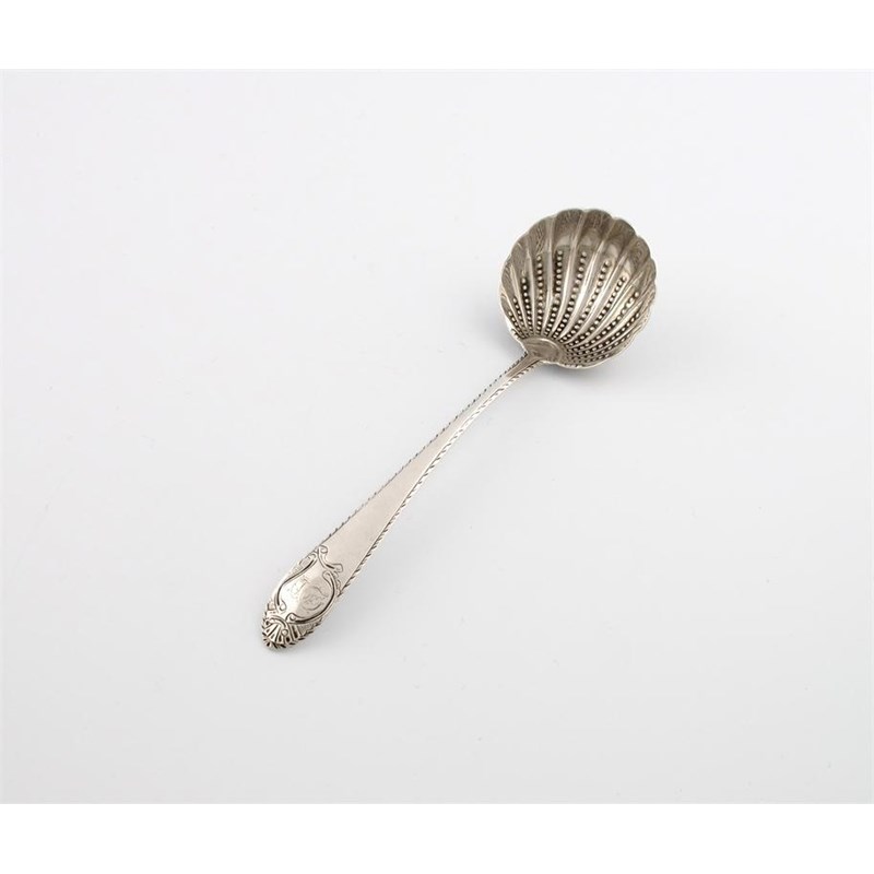 feather-edge border, the terminal with a scroll cartouche and initialled, beaded shell bowl, length 19.2cm, approx. weight 1.4oz.