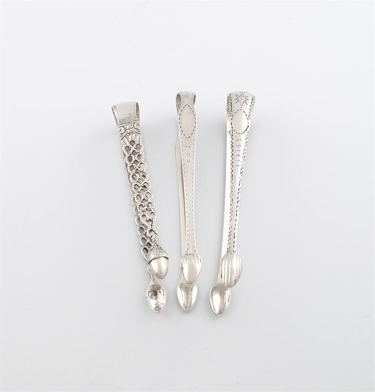 comprising a pair by John Shields, Dublin circa 1785, with bright-cut decoration and scratch initialled 'E.G', plus a cast pair with pierced decoration, acorn bowls, by Ambrose Nicklon, and a bright-cut pair, maker's mark of I.D, approx. weight 4.2oz. (3)
