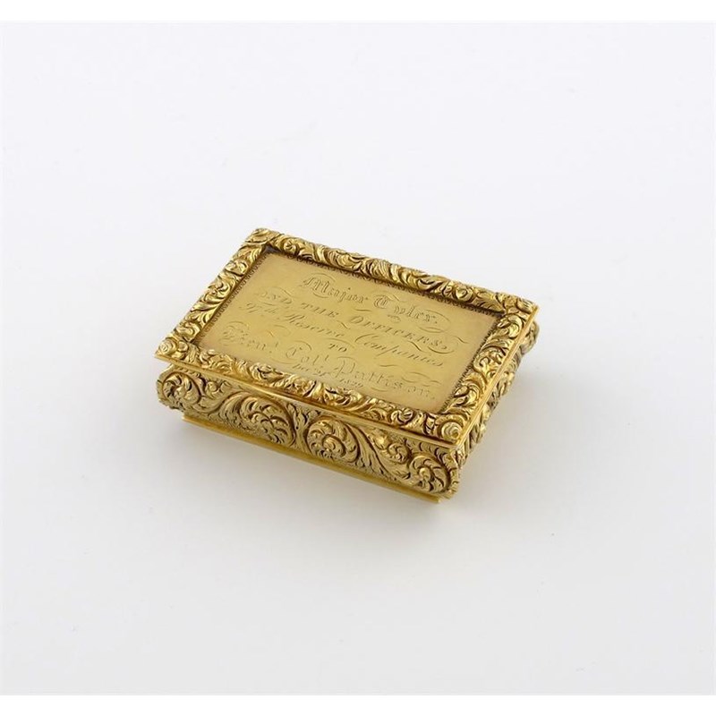 rectangular form, the sides with chased foliate scroll decoration, the hinged cover with a foliate scroll border and inscribed, 'Major Tyler and the Officers, 97th Reserve Companies to Lieut. Col Pattison, December 24th 1829', length 7.8cm, approx. weight 5.5oz.