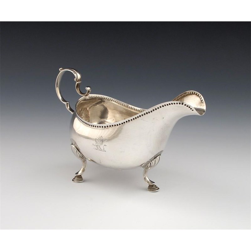 oval form, punch bead border, leaf capped scroll handle, on three shell capped hoof feet, engraved with a crest, length 18.5cm, approx. weight 6oz.