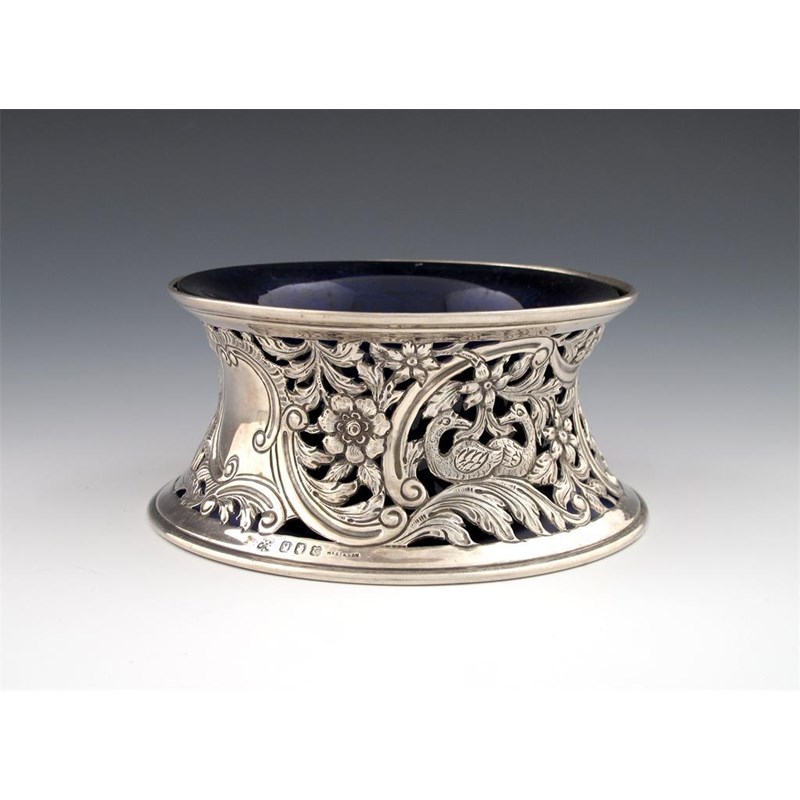 circular form, embossed and pierced with foliate scroll and bird decoration, with a blue glass liner, diameter at base 17.8cm, approx. weight 7oz.