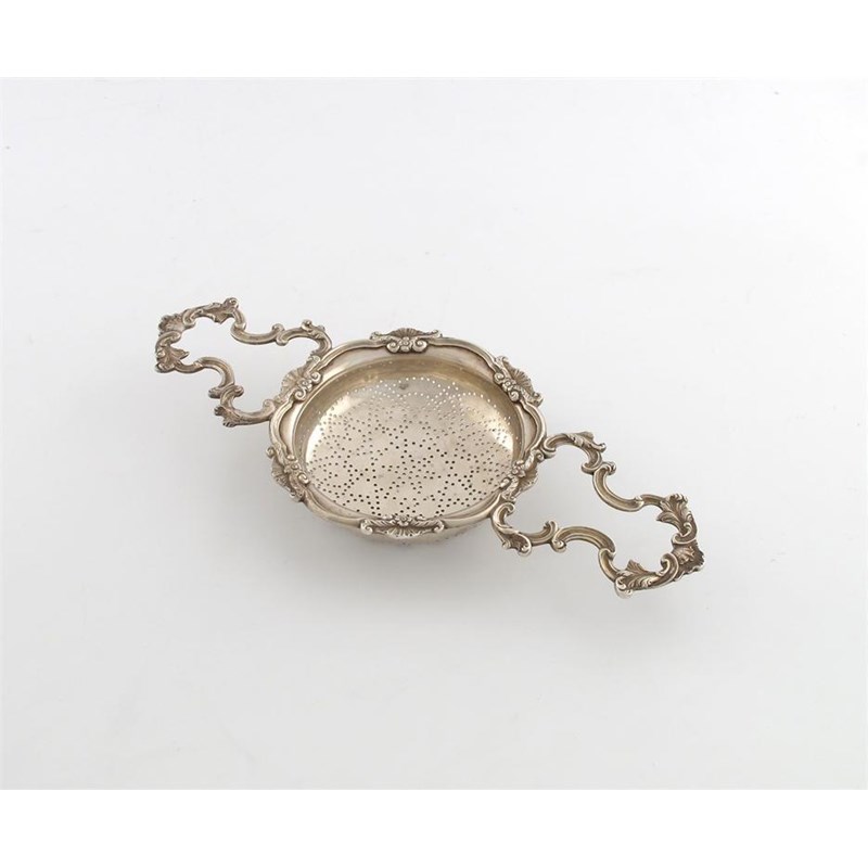 circular pierced bowl, with a foliate scroll border, with two large pierced foliate scroll side handles, scratch initialled 'E.C', length 27.5cm, approx. weight 6oz.