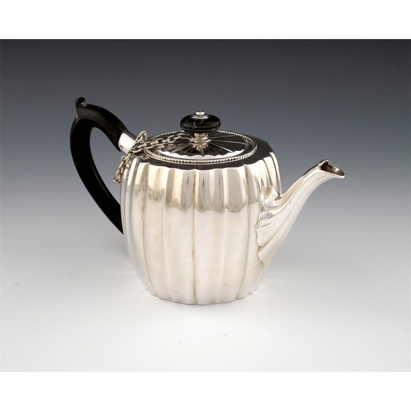 circular fluted form, scroll handle, the fluted pull-off cover with a beaded border and chain, wooden scroll handle and finial, length handle to spout 22.5cm, approx. weight 16oz.