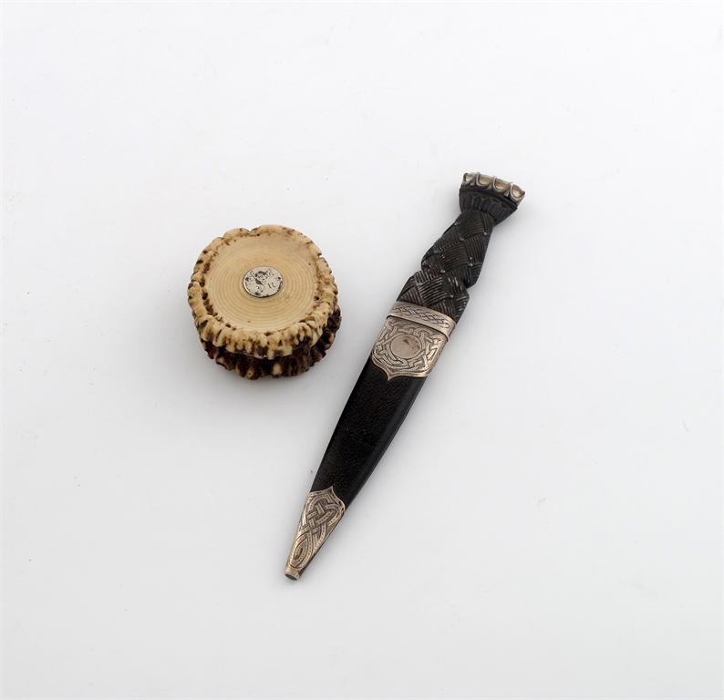 the mounts with Celtic decoration, th terminal set with a stone, length 20cm, plus a silver mounted antler snuff box, the unmarked mount initialled. (2)