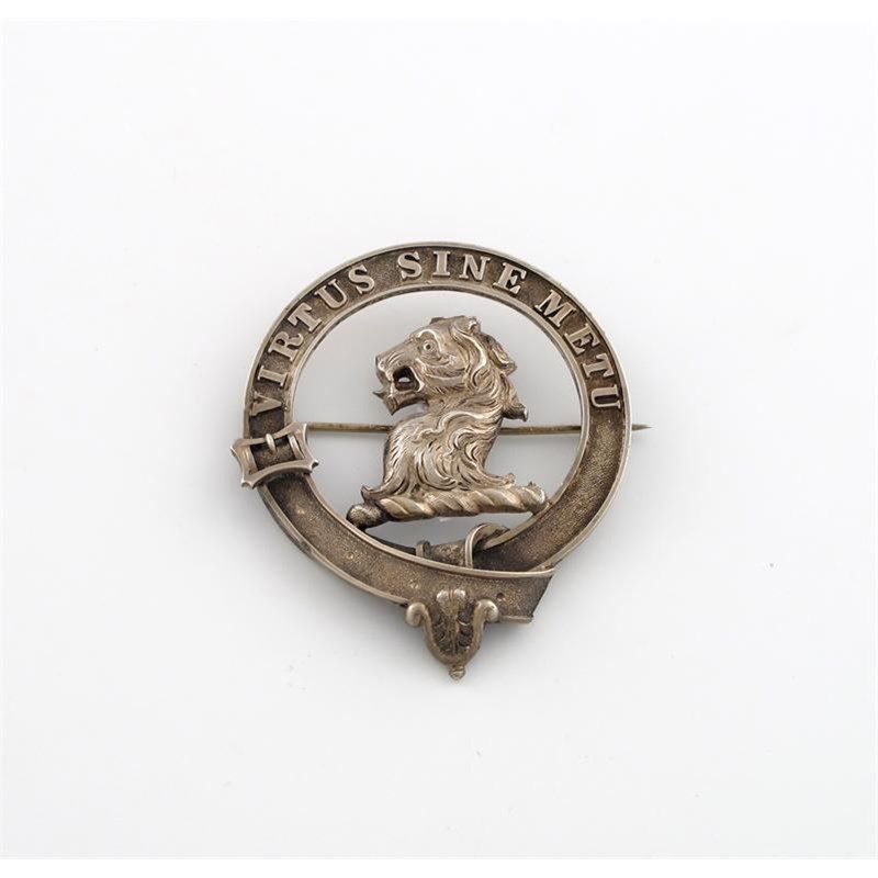 A circular Clan Badge of the Howard family, a lion's head left, motto around in Garter, VIRTUS SINE METU [Virtue without fear), maker's mark ACF, 52.5mm, c 1880-1900.