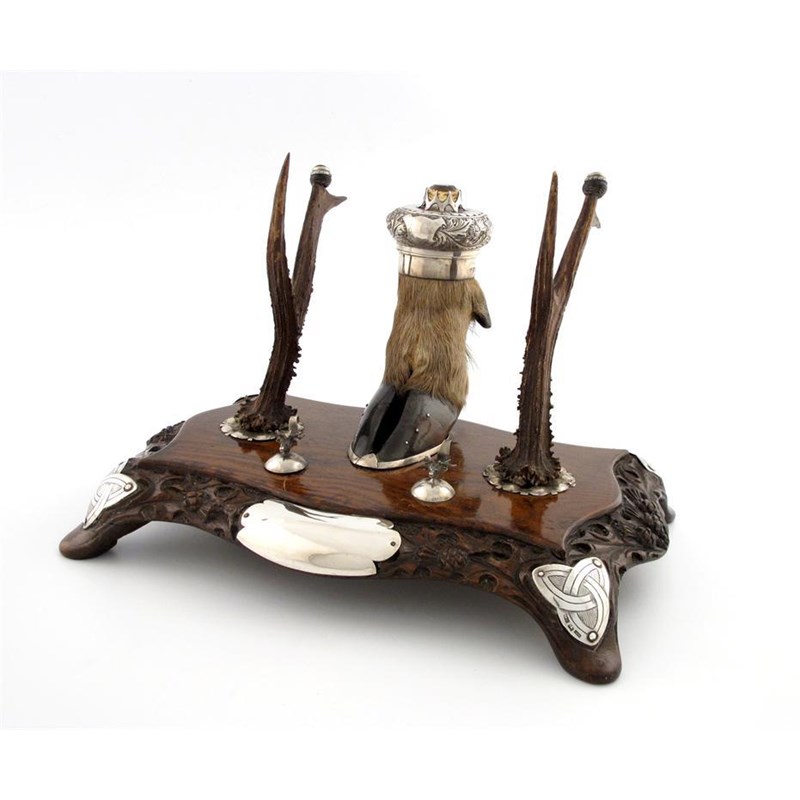 with a central silver mounted hoof inkwell with a central yellow stone, mounted either side with horns, the shaped rectangular base with a pen rest and carved thistle decoration with silver mounts with Celtic decoration, on four bracket feet, length 31cm.