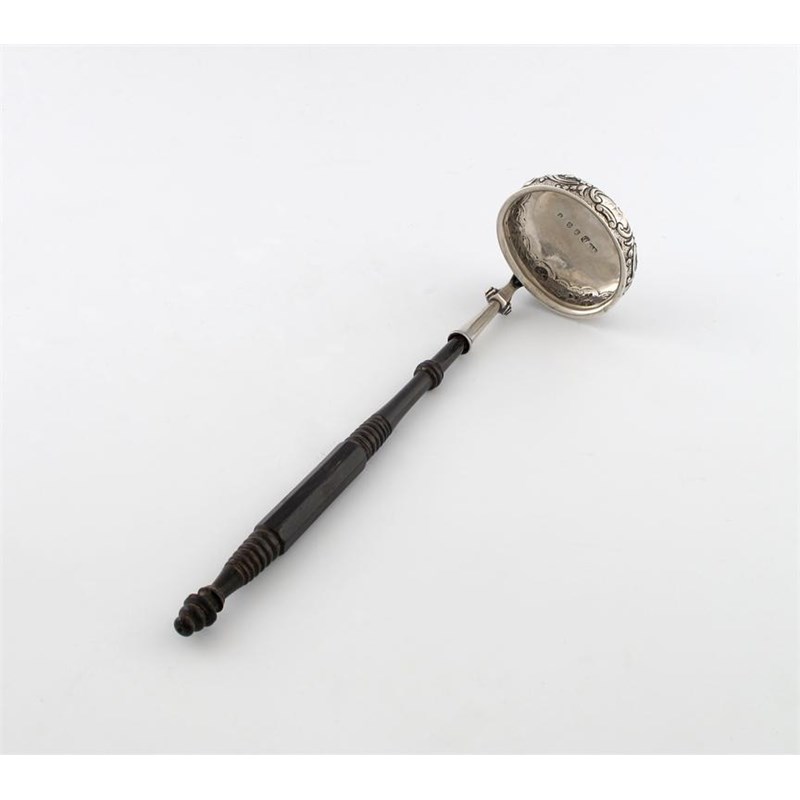 oval bowl with embossed foliate decoration, turned wooden baluster handle, length 29.5cm.