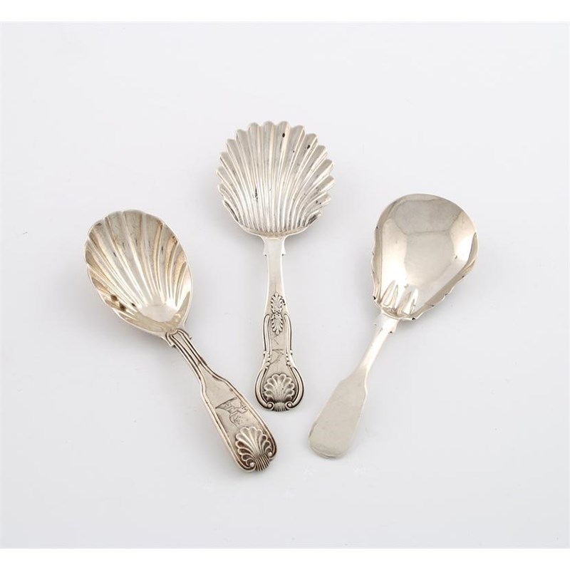 plain terminal and shaped bowl, plus another Scottish King's pattern caddy spoon, Edinburgh 1850, and a Victorian silver Fiddle, Thread and Shell pattern caddy spoon, by George Adams, London 1866. (3)