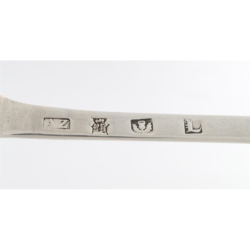 the reverse of the bowls with a plain heel, the reverse of the terminal with a script initial, length 20.5cm, approx. weight 3.8oz. (2)