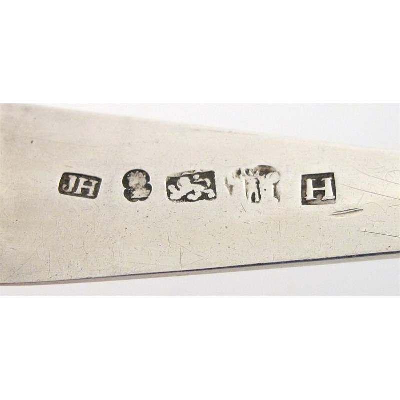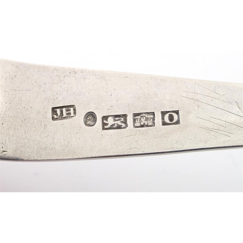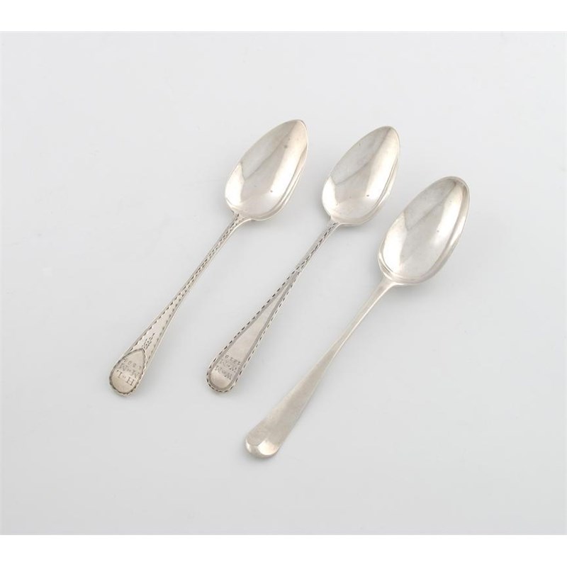 the reverse of the terminal with a monogram, plus two George III Bright-cut tablespoons, by Joseph Hicks, Exeter 1804 and 1810, the terminals scratch initialled 'H*L' over 'M*M' '1804', and 'W*M' over' W*M' '1810', approx. weight 4.5oz. (3)