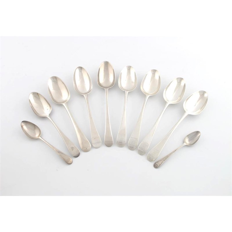 comprising: a matched old English pattern set of four tablespoons, plus four other tablespoons and a teaspoon, plus a bright-cut teaspoon, approx. weight 18oz. (10)