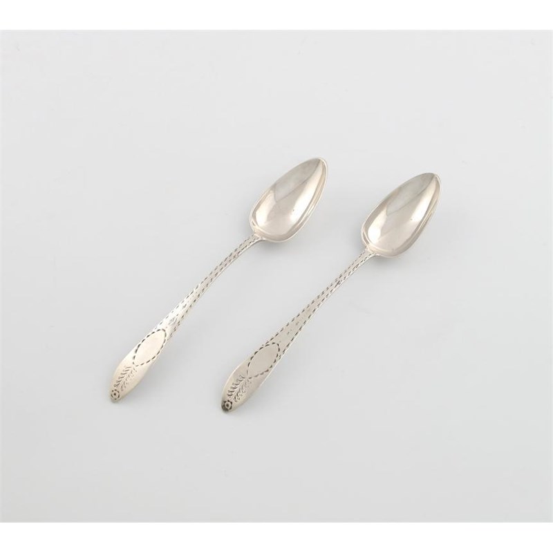 A pair of George III Irish provincial silver Bright-cut dessert spoons,