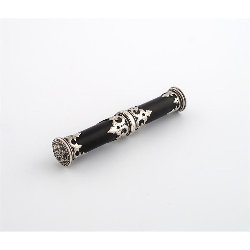 cylindrical form, pierced cut card work mounts, the terminals with the Royal Cipher of Queen Victoria and the Arms of Edinburgh, the centre band inscribed 'COUNCILLOR'S BATON 1856', length 11.3cm.