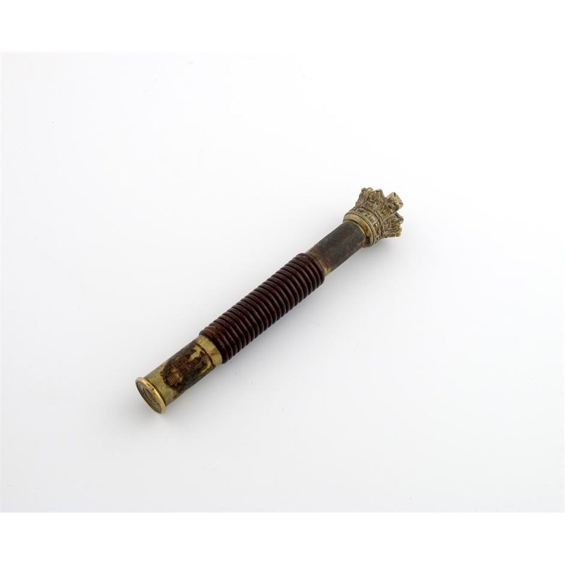cylindrical form, ribbed wooden handle, the terminal mounted with a crown, and engraved with the crest of Edinburgh and the Royal shield, length 19cm.