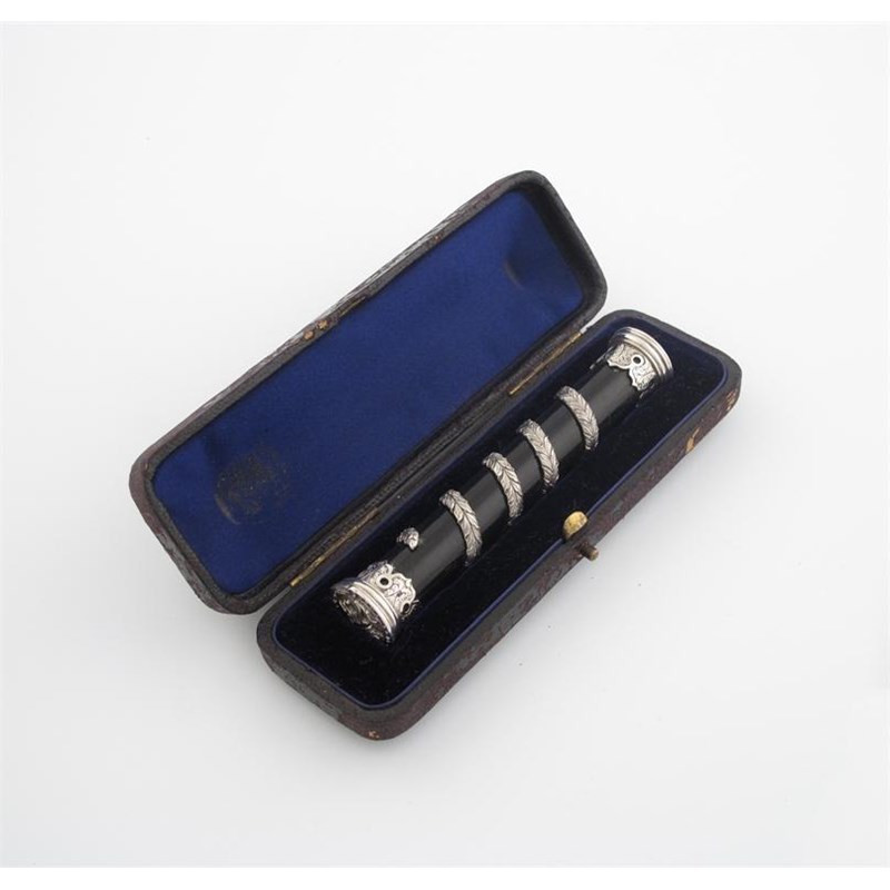 cylindrical form, the terminals with the arms of Edinburgh and the Royal Cipher of Queen Victoria, the body with swirling foliate band inscribed 'CITY SURVEYOR', in a fitted case, length 10.8cm.