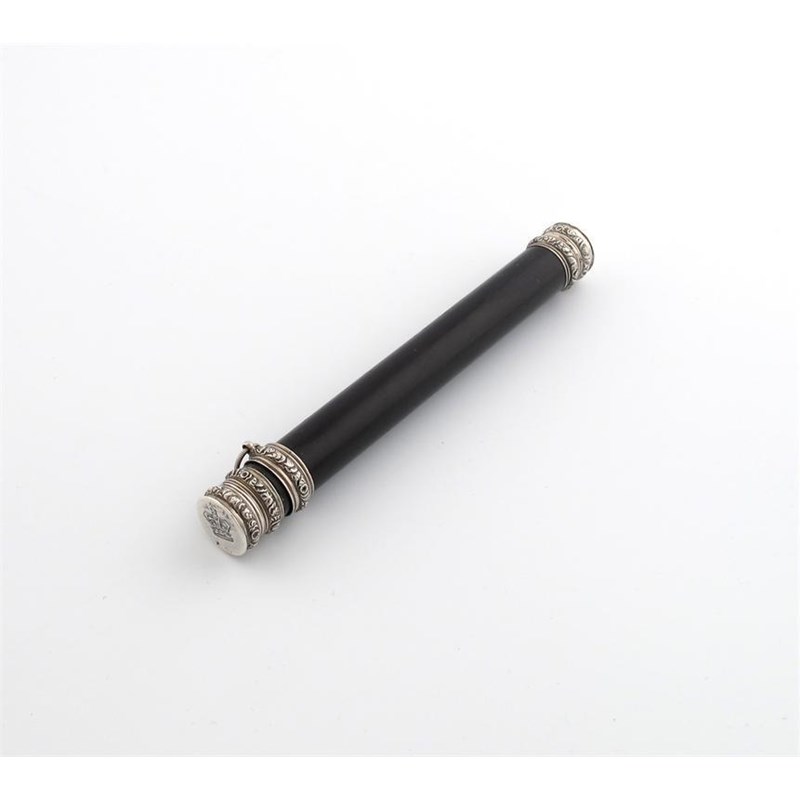 cylindrical form, the terminals with foliate mounts and engraved with a crown and inscribed 'W.J.M' 'EDINB', the centre with a sliding foliate ring, length 14.9cm.