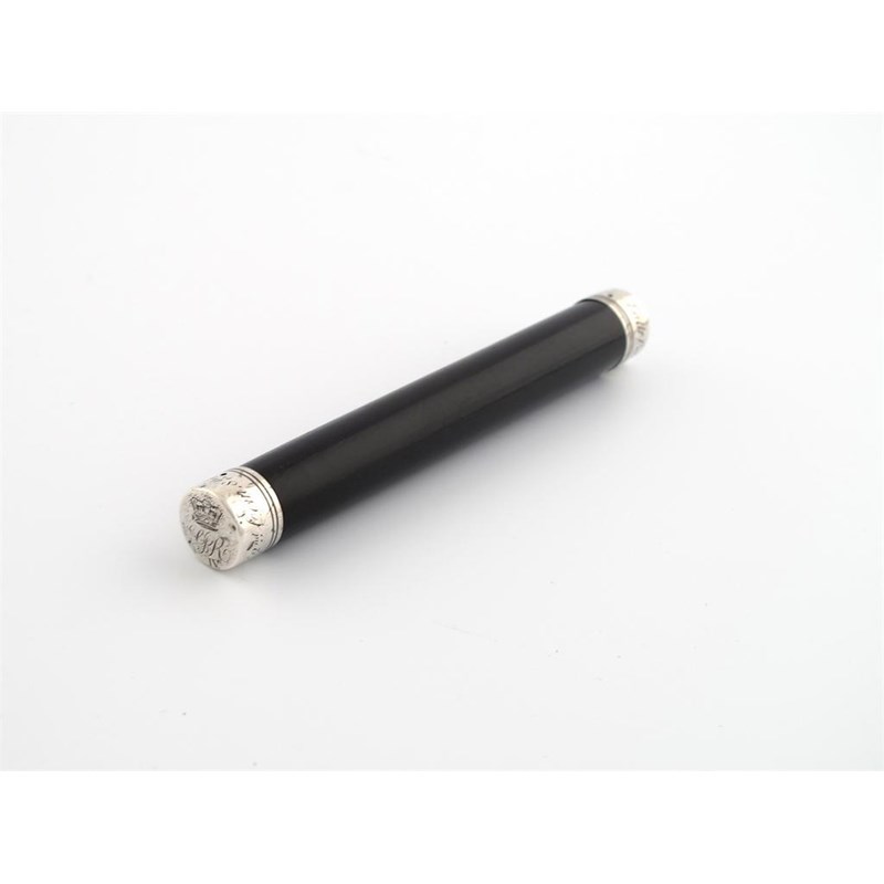plain cylindrical form, one mount engraved with the arms of Leith, and inscribed 'Leith Police 1827', the other mount engraved with the Royal cipher of George IV and inscribed '2nd Com 8th Ward', length 12.7cm.