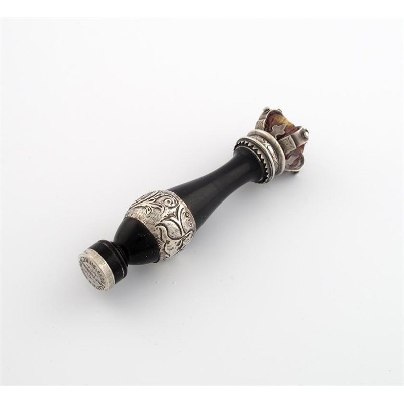 the baluster shaped handle with a foliate mount, and with a pierced silver and velvet crown finial, (missing central finial), the base with an electroplate matrix engraved 'CAPTAIN MUNRO CHIEF CONSTABLE ROSS-SHIRE,' length 12cm.