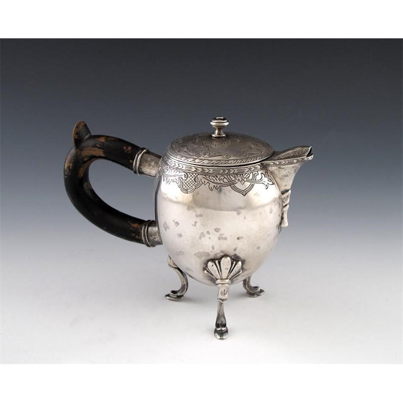 ovoid form, elongated scroll handle, engraved foliate decoration, flush hinged cover, on four scroll hoof feet, height 15cm.