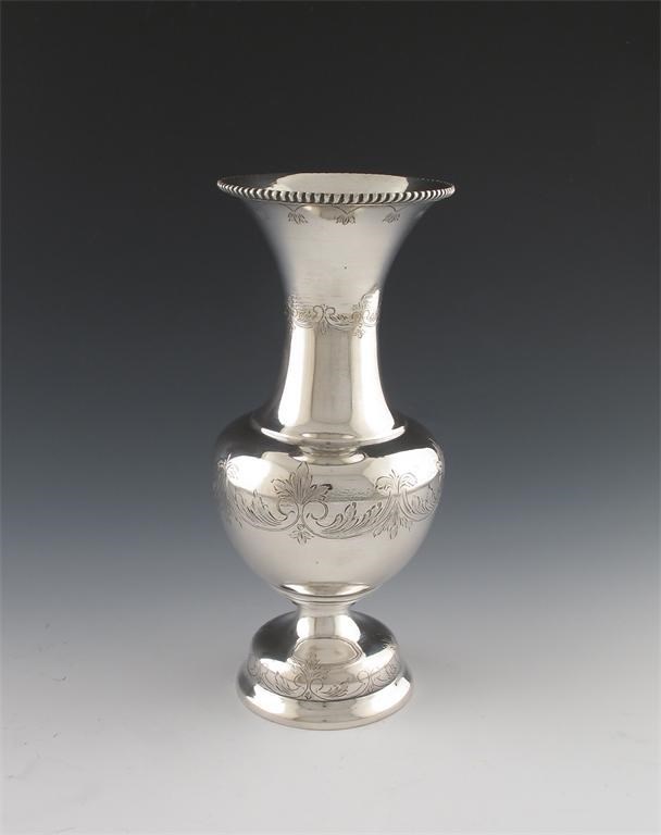 baluster form, engraved foliate decoration, on a raised circular foot, gadroon border, height 24.7cm, approx. weight 13oz.