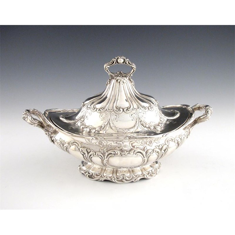 lobed oval form, scroll side handles, domed pull-off cover with fluted and ribbon-tied garlands of swags, on a shaped oval foot, length handle to handle 30cm, approx. weight 36oz.