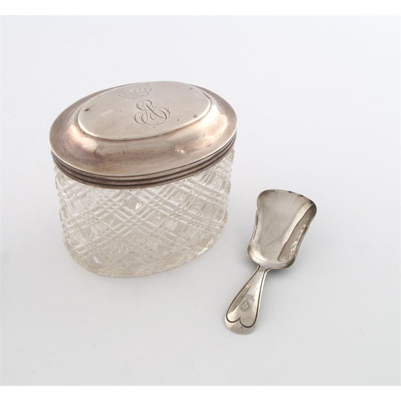 oval form, the pull-off cover with a monogram below a coronet, length 10.2cm, plus a Dutch silver caddy spoon, 1907. (2)