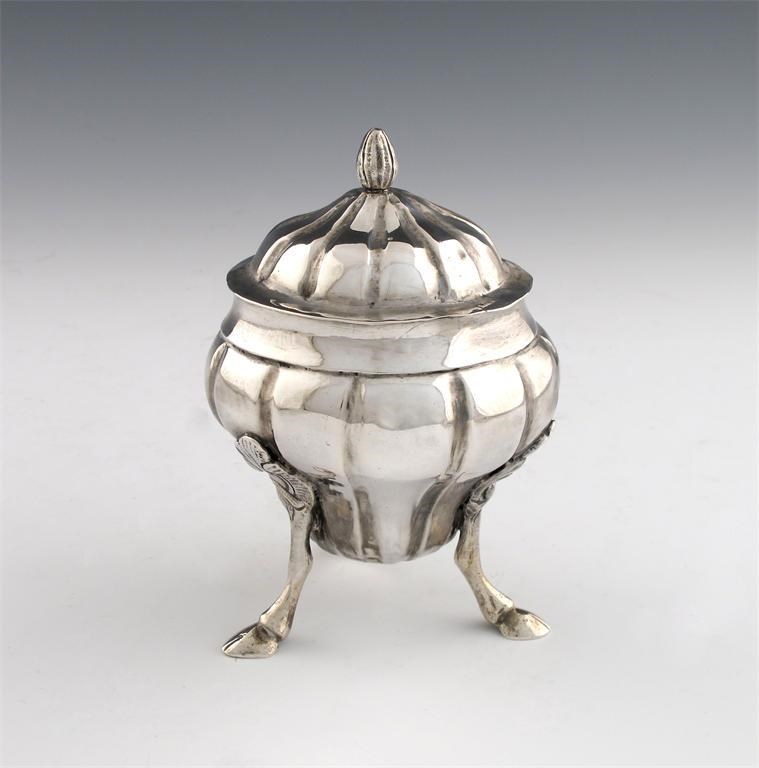 circular baluster form, fluted pull-off cover with a tapering finial, on three legs terminating in hoof feet, height 12.5cm, approx weight 8.5oz.