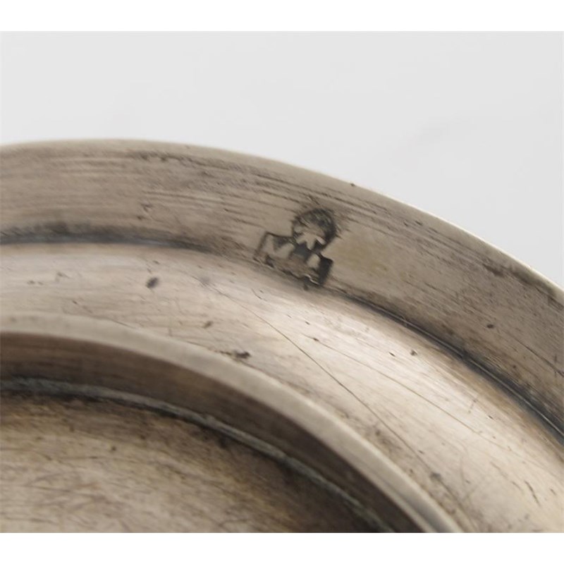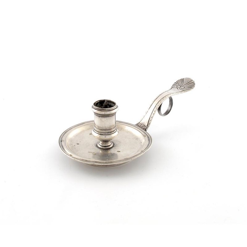 circular form, the handle with a shell terminal and engraved decoration, spool shaped capital, on a raised circular foot, length 17.2cm, approx. weight 4.5oz.