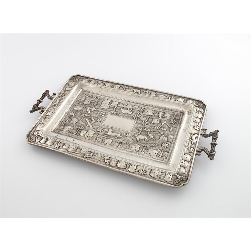 rectangular form, chased with elephants and figural scenes in landscapes, central vacant cartouche, on four bracket feet, length 38.5cm, approx. weight 22oz.