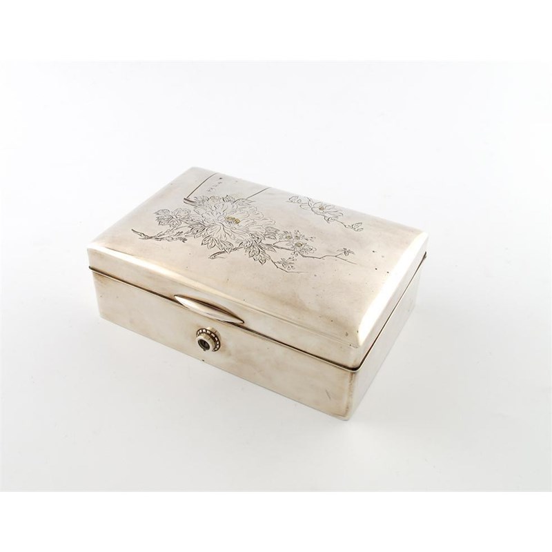 rectangular form, the hinged cover with engraved foliate decoration with gilded highlights, the hinged cover opens to reveal a velvet lined interior with a pull-out tray, hardwood base, length 18cm.