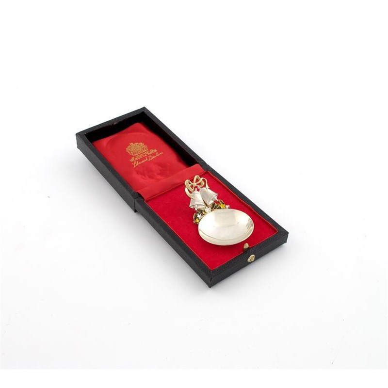 circular bowl, the handle formed as ribbon-tied bells and with foliate enamel decoration, length 6.6cm, approx. weight 0.9oz.