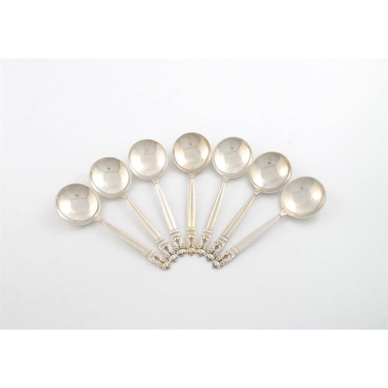 By Georg Jensen, a set of seven Danish silver Acorn pattern soup spoons,