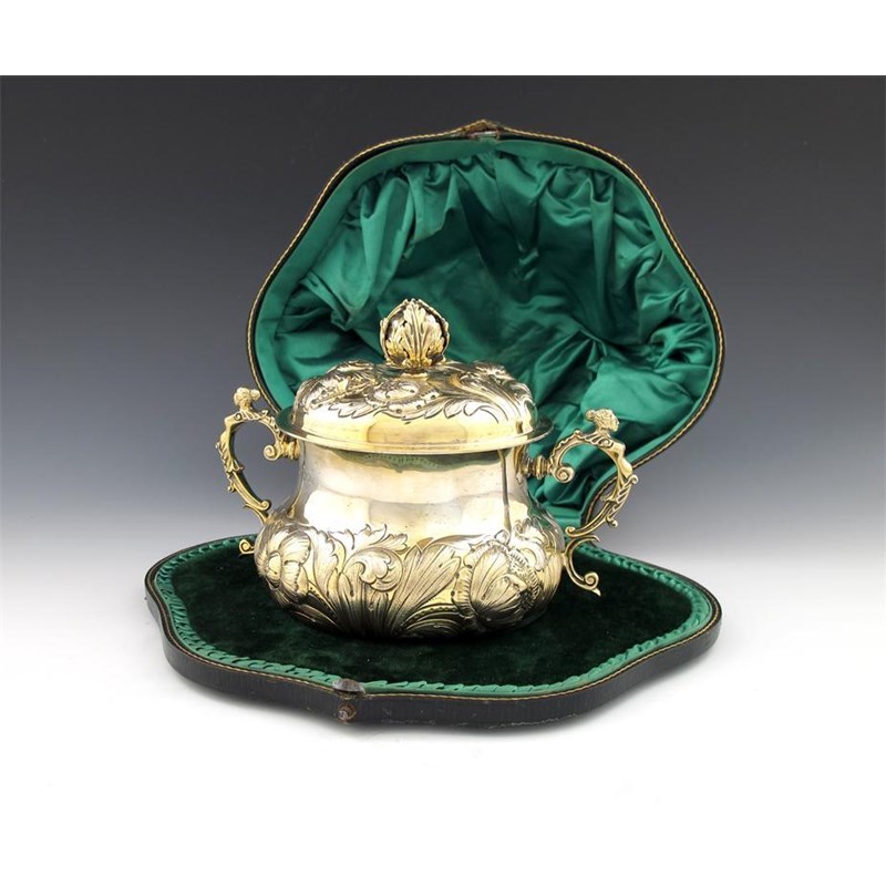 in the Charles II manner, circular bellied form, embossed foliate decoration, caryatid scroll handles, the cover with a foliate finial, in a fitted case, height 14cm, approx. weight 19oz.
